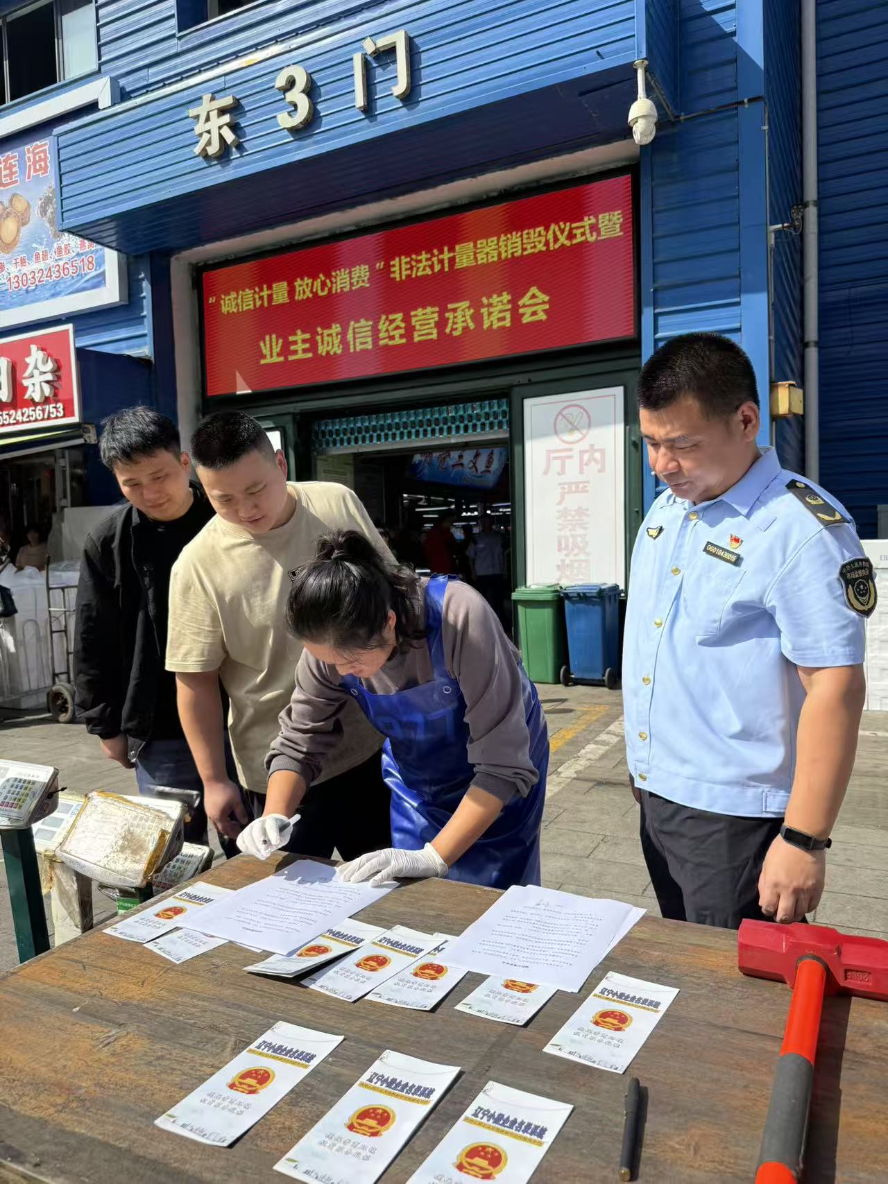 国庆假期将至,食品消费进入高峰期,为切实守护群众“舌尖上的安全”,9月25日上午,皇姑区市场监督管理局联合区文明办、区新时代文明实践中心,在塔湾北行农贸市场开展“诚信计量·放心消费”十一假期食品消费安全专项行动,通过集中销毁非法计量器具、组织商户承诺等举措,将“文明服务、诚信经营、热情宠客”理念融入食品市场治理,为假期食品消费安全注入“强心剂”。