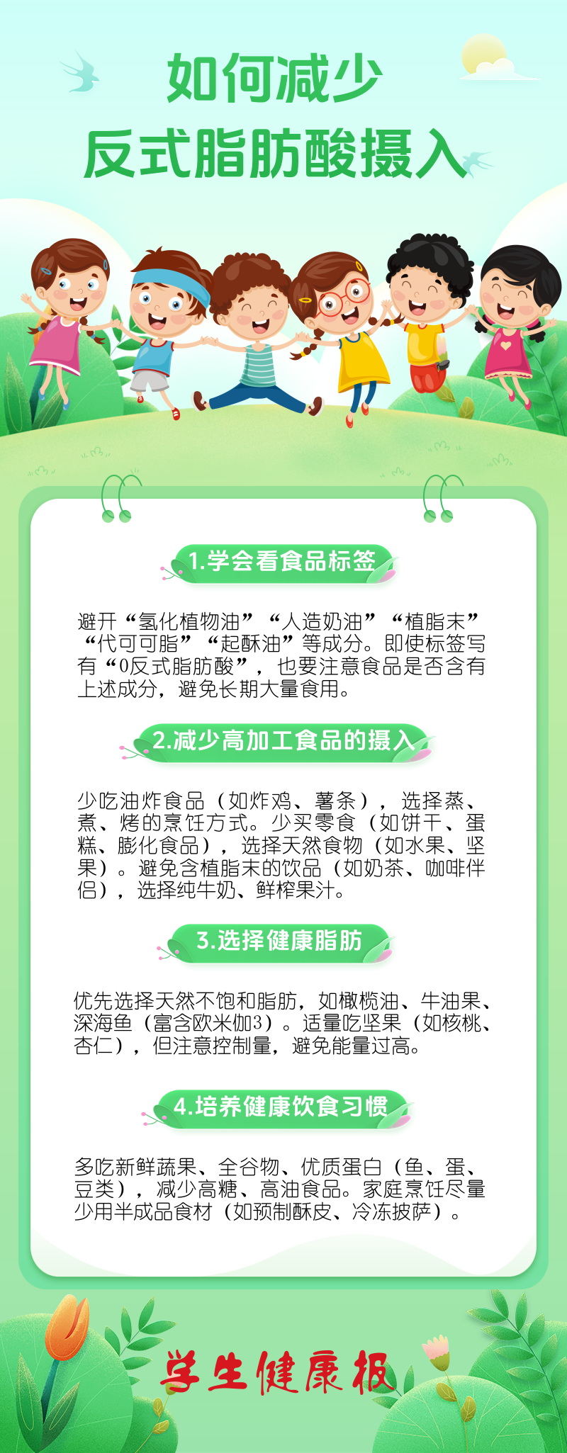 反式脂肪酸可能影响大脑发育和认知功能,并带来多种健康风险。家长应尽量减少孩子摄入含反式脂肪酸的加工食品,选择天然、健康的食物,培养良好的饮食习惯,才能让孩子更健康地成长。