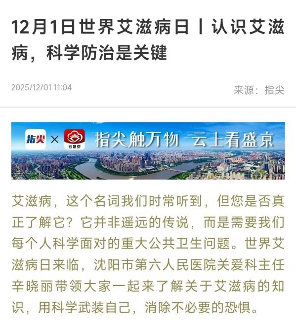 2025年12月1日是第38个“世界艾滋病日”,今年我国宣传主题为“社会共治,守正创新,终结艾滋”。为深入践行“健康中国2030”战略部署,切实提升公众艾滋病防治知识知晓率与社会参与度,沈阳市第六人民医院充分发挥传染病防治专业引领作用,以“部门协同、场景创新、精准施策”为核心,整合医疗、公卫、宣传等多部门优势资源,策划开展了覆盖多群体、多场景的系列宣传活动,用专业与温情织密防艾防护网,为推进“健康沈阳”建设注入坚实力量。