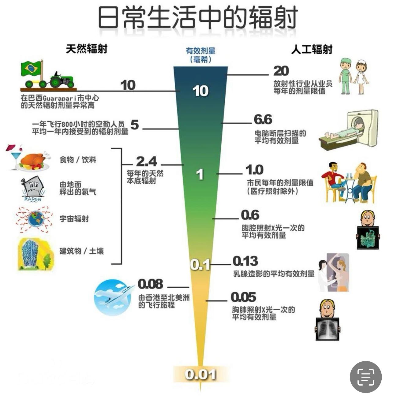 咱们每天都在接触“天然本底辐射”:土壤、空气、宇宙射线,甚至食物中都有微量辐射,每人每年平均暴露剂量约2.4mSv(其中宇宙射线0.4mSv、地面γ射线0.5mSv、氡吸入1.2mSv、食物摄入0.3mSv)。这个剂量对身体没有任何不良影响,就像每天呼吸空气一样安全。