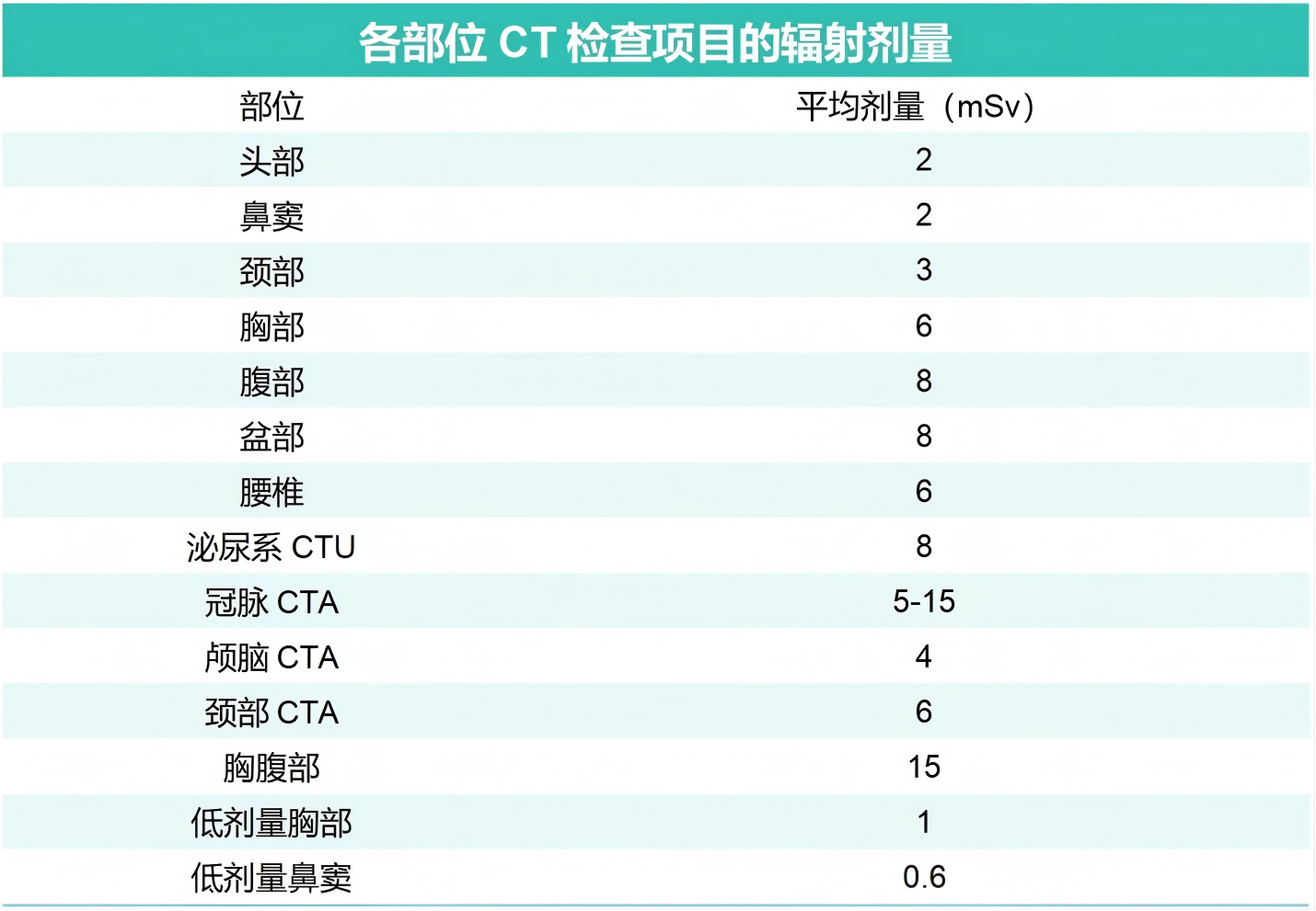 以下是国家《X射线计算机断层摄影成年人诊断参考水平》明确的各部位CT平均剂量,更直观感受“低剂量”: