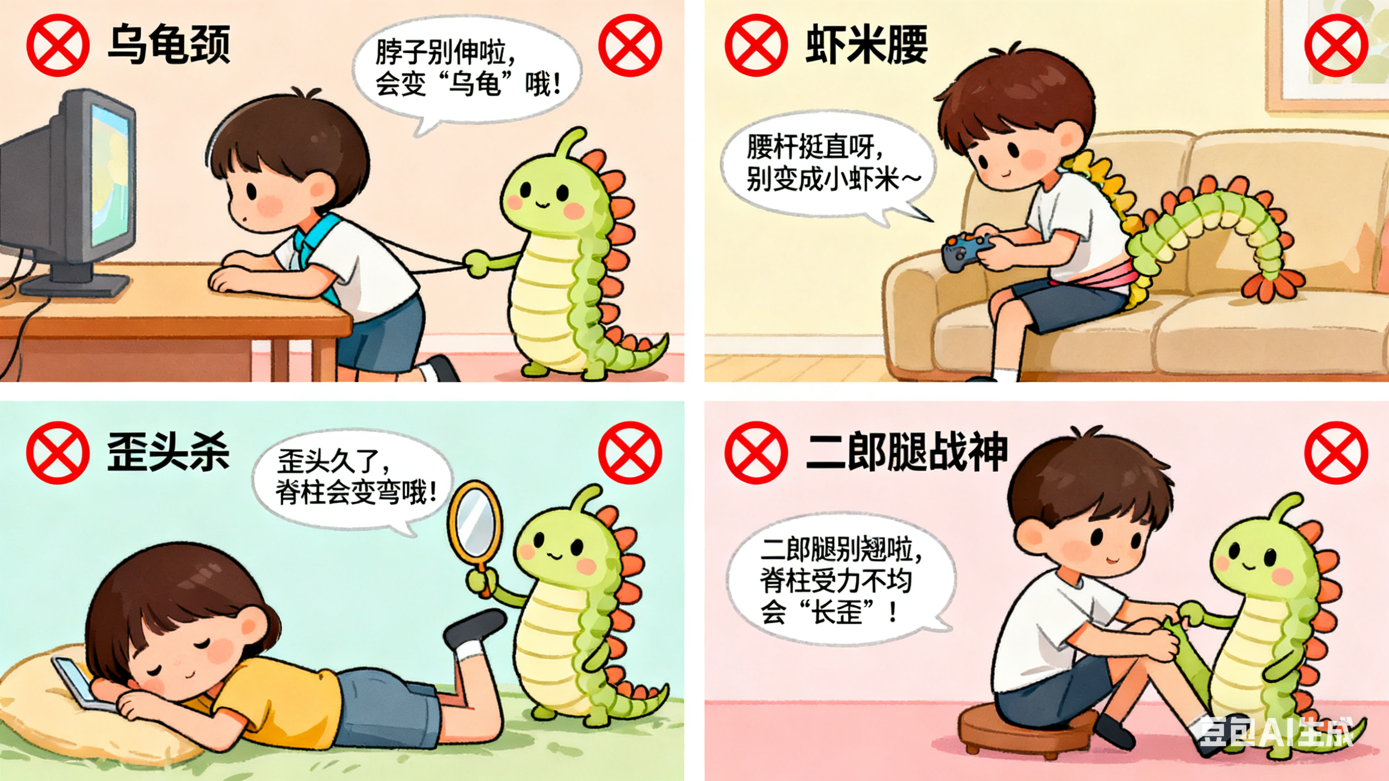 答:寒假里,孩子长时间低头看手机,会让颈椎承受巨大压力,就像扛着很沉的重物,长时间增加颈椎压力,易形成“手机脖”;坐姿不正打游戏,可能导致腰椎正常曲度消失,易形成“游戏腰”。此外,一动不动盯电视的“乌龟颈”、侧躺追剧的“歪头杀”以及不自觉跷二郎腿的姿势,都对脊柱危害很大。