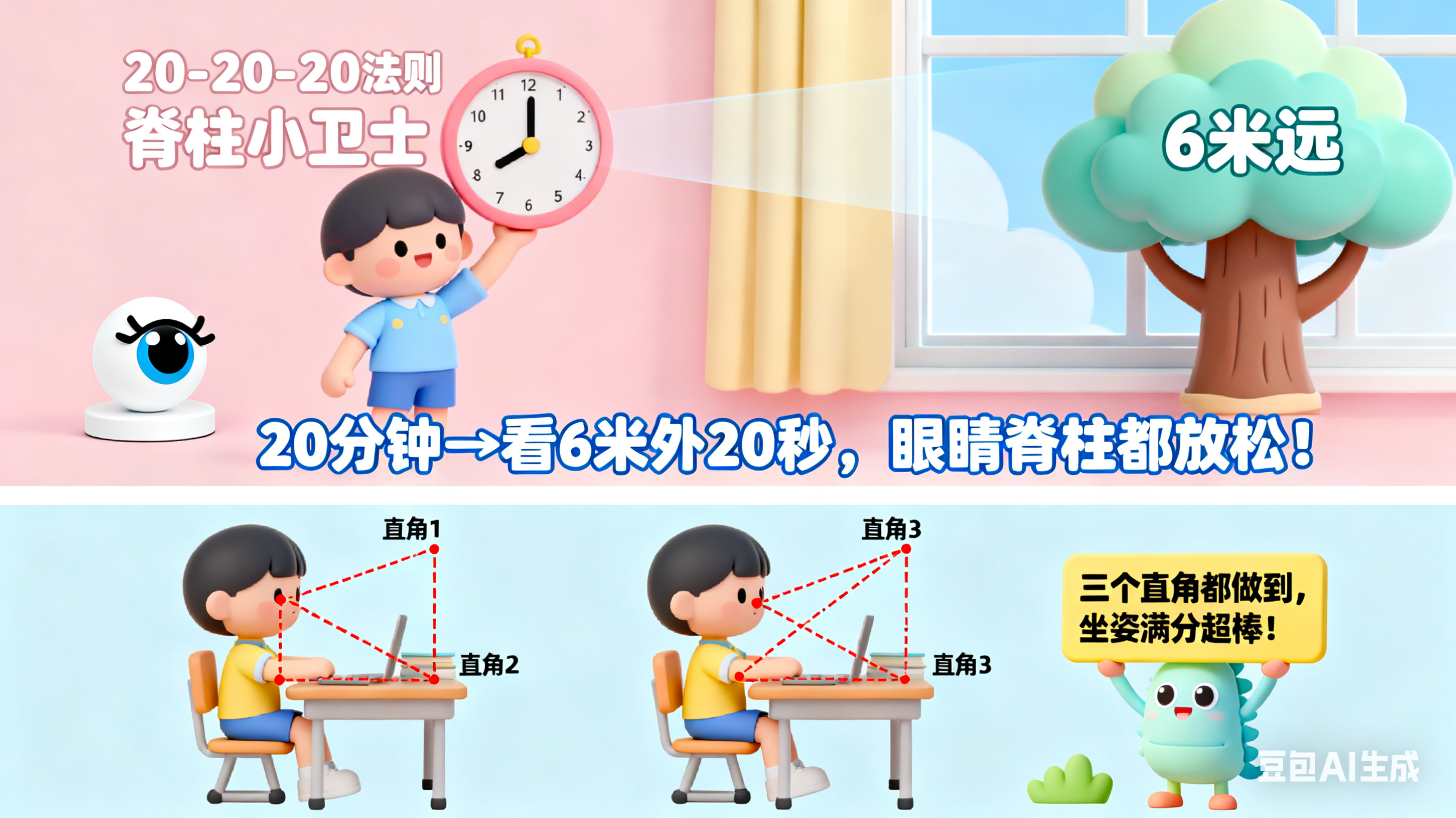 答:可以遵循“20-20-20法则”,也就是看书或使用电子产品20分钟后,看向20英尺外的物体20秒;坐姿上要遵守3个直角法则,眼睛与屏幕平视形成第一个直角,手肘弯曲90°放在桌面形成第二个直角,膝盖弯曲90°、脚踩实地面形成第三个直角。另外,建议给孩子设置使用电子产品和写作业的时间,让他们多活动肩颈和腰椎。
