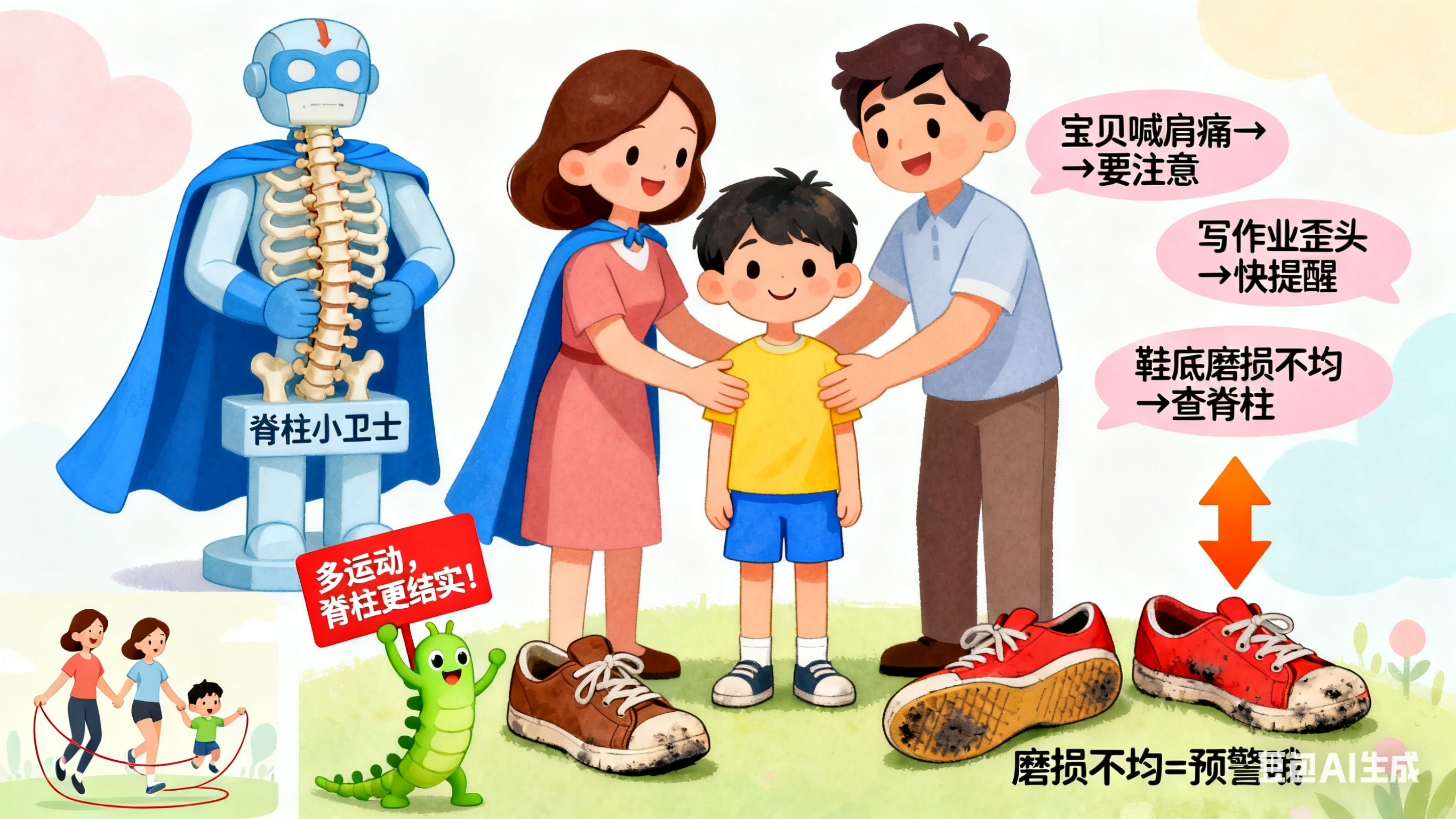 答:孩子经常喊肩膀酸痛、写作业习惯歪头,或者出现鞋底磨损不平的情况,这些都是脊柱侧弯的重要预警,家长要及时重视,平时的锻炼必不可少,再加上定期给孩子们做体检,也可以及时发现和改善不良体态,保护脊柱健康。