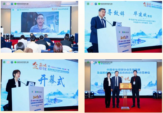 开幕式上,中国医科大学附属第一医院泌尿外科主任毕建斌教授率先致辞,对远道而来的各位专家及参会学员表示热烈欢迎,向长期支持盆底医学发展的同仁致以诚挚谢意。他说,“盆”程万里不仅象征着盆底疾病诊疗领域的广阔发展前景,也代表着我们对这一领域长期探索的决心。希望各位学员能在本次培训中学有所获、学以致用,让更多临床工作者掌握扎实的诊疗技能。中国人民解放军中部战区总医院潘铁军教授在致辞中强调,排尿及盆底功能障碍性疾病已成为影响居民生活质量的高发慢性病,本次培训课程旨在搭建一个高水平的学术交流平台,推动盆底疾病诊疗技术的规范化和标准化发展。盆底疾病诊疗需要多学科协作、全周期管理,希望以此次会议为纽带,促进多学科交流协作,让先进诊疗技术惠及更多患者。随后举行了盆底疾病诊疗技术示范中心授牌仪式。中国医科大学附属第一医院泌尿外科刘娇教授主持开幕式和盆底疾病诊疗技术示范中心授牌仪式。