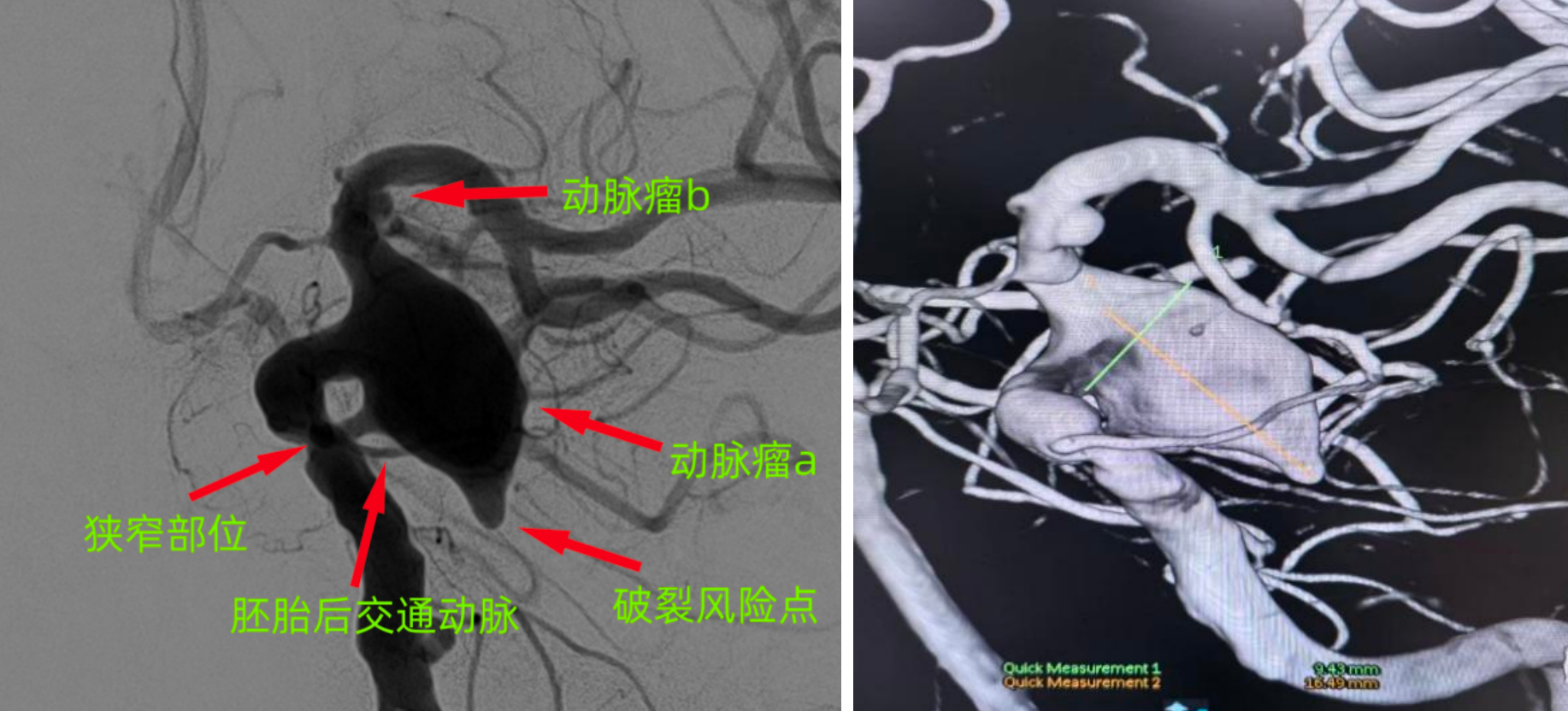 今年83岁的患者王女士(化名),近两个月来被反复头痛困扰,近一周症状突然加重,严重影响生活质量。就医后,颅内血管造影(DSA)结果令人揪心:左侧颈内动脉后交通段存在一枚(16.5mm×11.3×9.4mm)的巨大动脉瘤(a),瘤体顶部还附着一枚岌岌可危的子瘤,如同随时可能引爆的“炸弹”;颈内动脉末端还发现另一动脉瘤(b),形成多瘤并存的复杂局面。